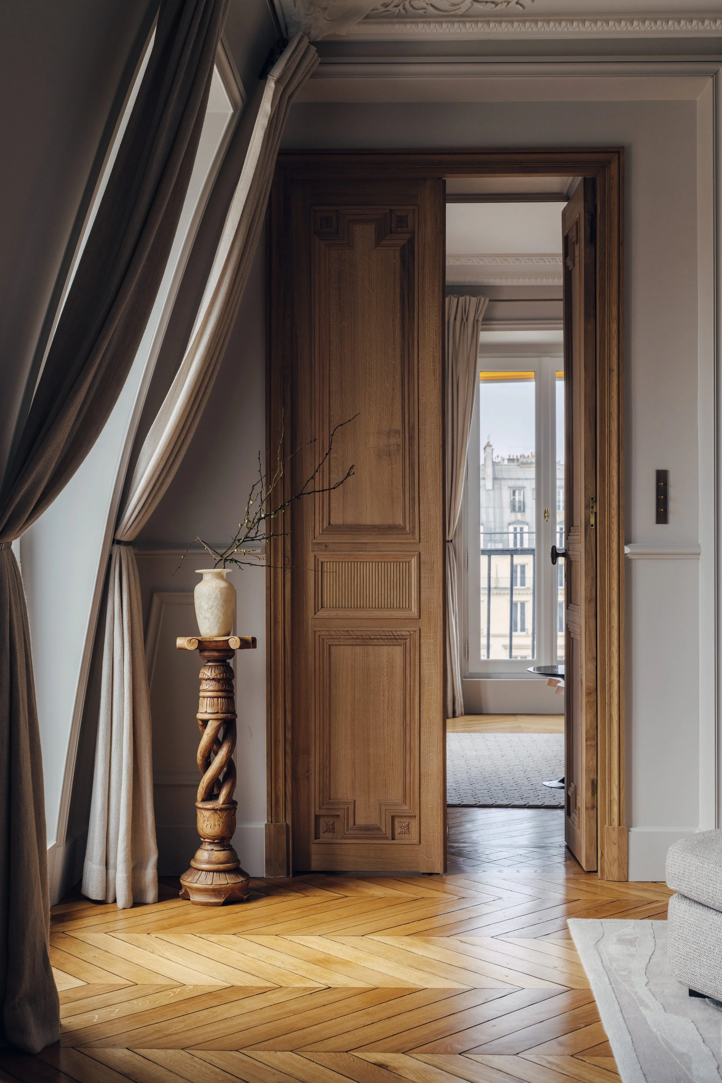 Le projet naît d'un regard porté vers le patrimoine environnant. Les rosaces du beffroi du Louvre ont inspiré l'ensemble du vocabulaire décoratif - sans jamais chercher à copier. Restructuration complète, réouverture de conduits de cheminée, modification de porteurs : l'intervention architecturale a été d'envergure pour retrouver l'âme d'un lieu parisien authentique. Orienté ouest et nord, l'appartement baigne dans une lumière jamais frontale, toujours douce et changeante. Cette qualité lumineuse particulière a guidé tous les choix chromatiques : des tons crème, lactés, taupe et naturels qui évoquent la pierre des façades haussmanniennes sous le soleil de la Seine. Les rosaces qui ornent le beffroi du Louvre ont été réinterprétées sur les portes en chêne naturel, dessinées par l'agence et réalisées par des menuisiers d'art. Cette alliance entre moulures classiques et cannelures modernes définit l'esprit du lieu : un classicisme réinventé, jamais pastiche, toujours ancré dans son époque.